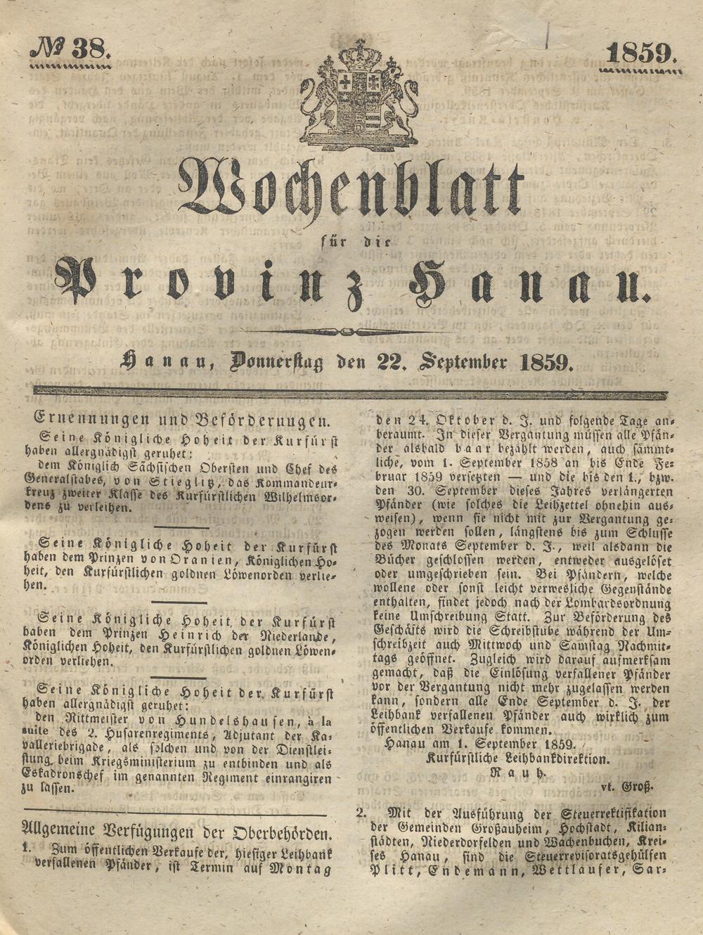 Wochenblatt für die Provinz Hanau. 1851-1866