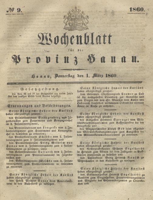Wochenblatt für die Provinz Hanau. 1851-1866