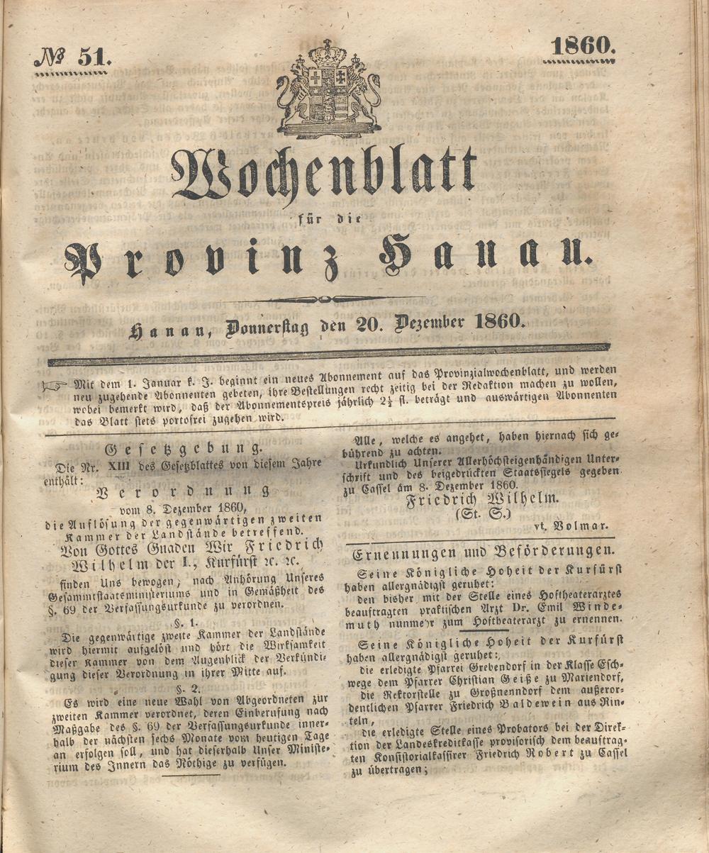 Wochenblatt für die Provinz Hanau. 1851-1866